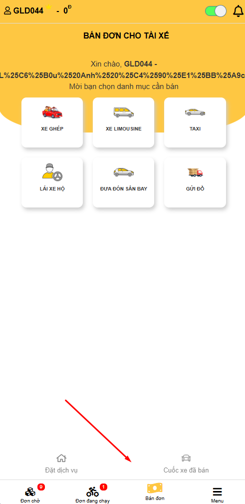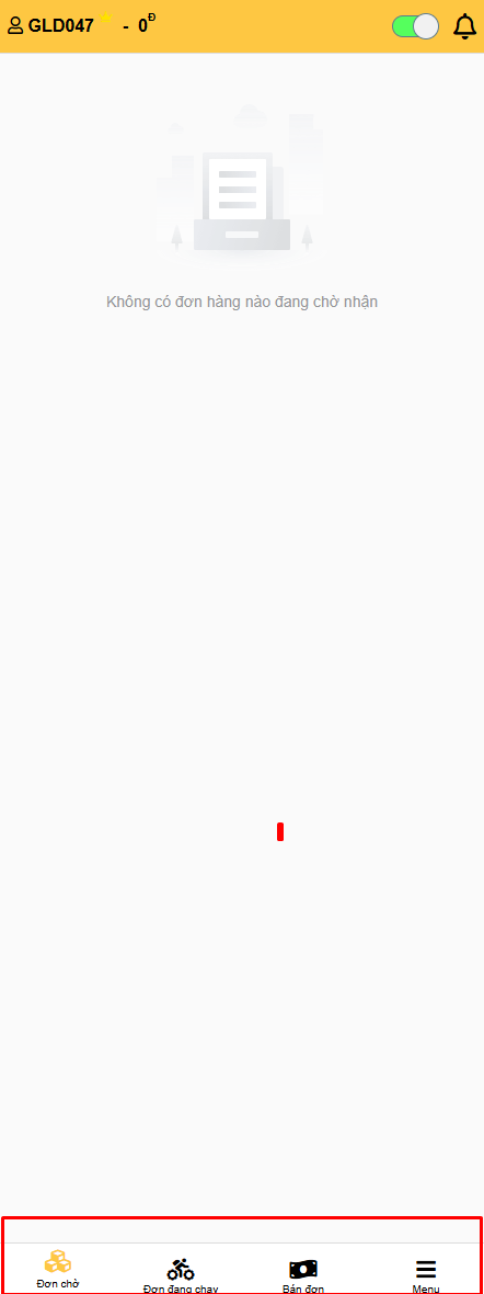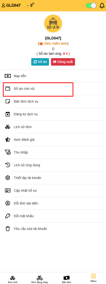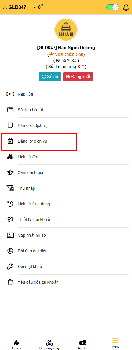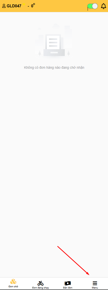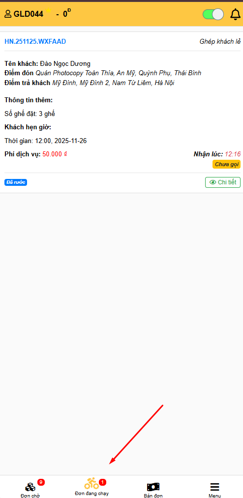 - Khi khách hàng đặt chuyến, đơn sẽ hiển thị ở 'Đơn Chờ' dưới thanh Menu