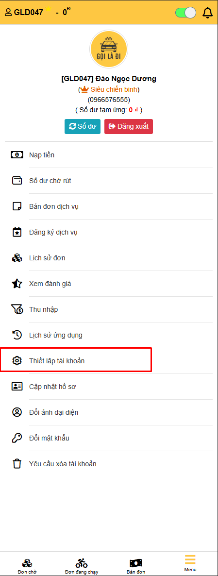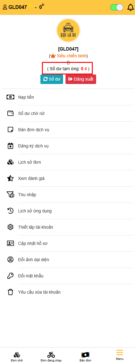 - Nạp tiền vào tài khoản mới có thể nhận chuyến