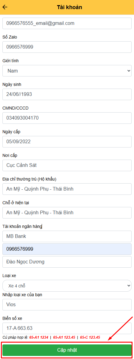 - Điền đúng và đầy đủ thông tin → Nhấn 'CẬP NHẬT'