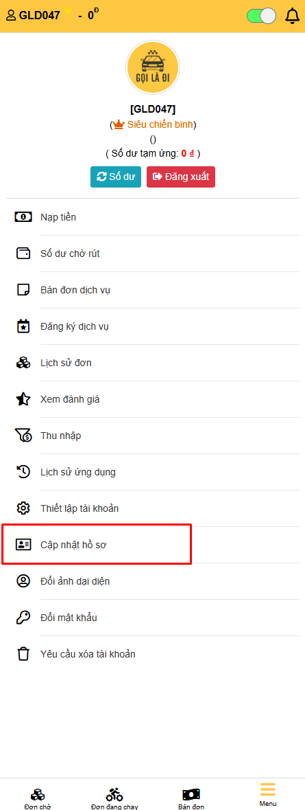 - Quay trở lại Menu → Chọn 'CẬP NHẬT HỒ SƠ'