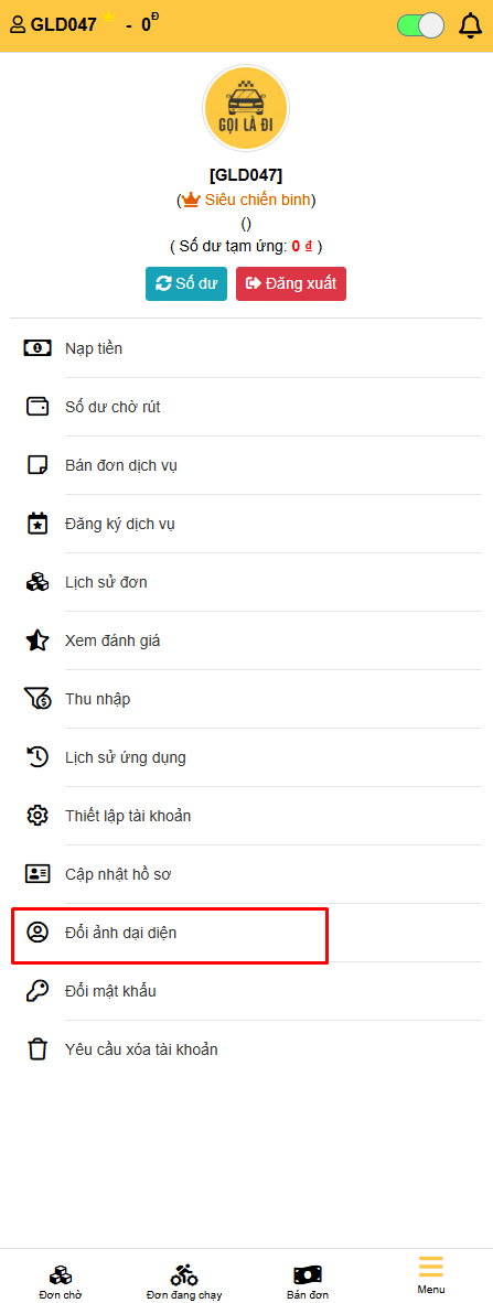- Quay trở lại Menu → Chọn 'ĐỔI ẢNH ĐẠI DIỆN'
