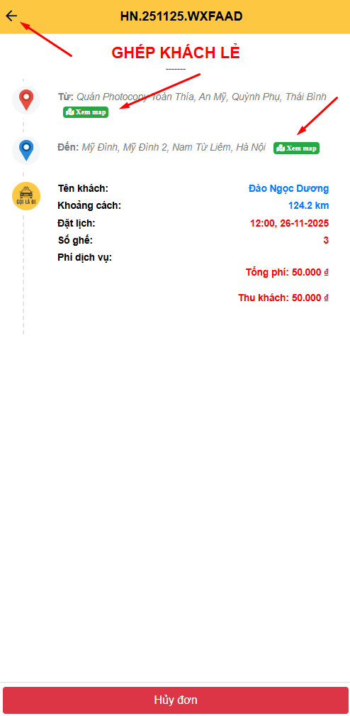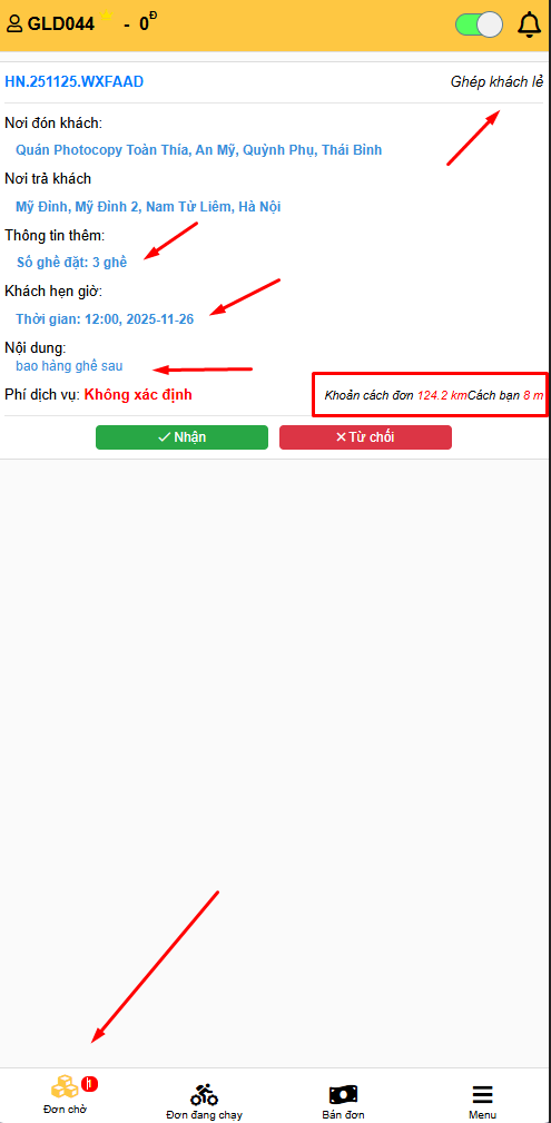 - Thông tin đơn hiển thị đầy đủ: Ghép khách lẻ hay bao xe 4 chỗ, 7 chỗ, Số ghế đặt, Thời gian đặt lịch, Nội dung ghi chú, Khoảng cách của đơn, Khoảng cách đến điểm đón khách...