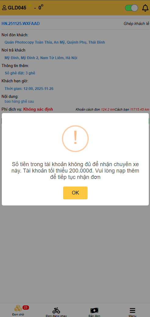 - Nếu tài khoản không đủ tiền, sẽ không nhận được đơn.